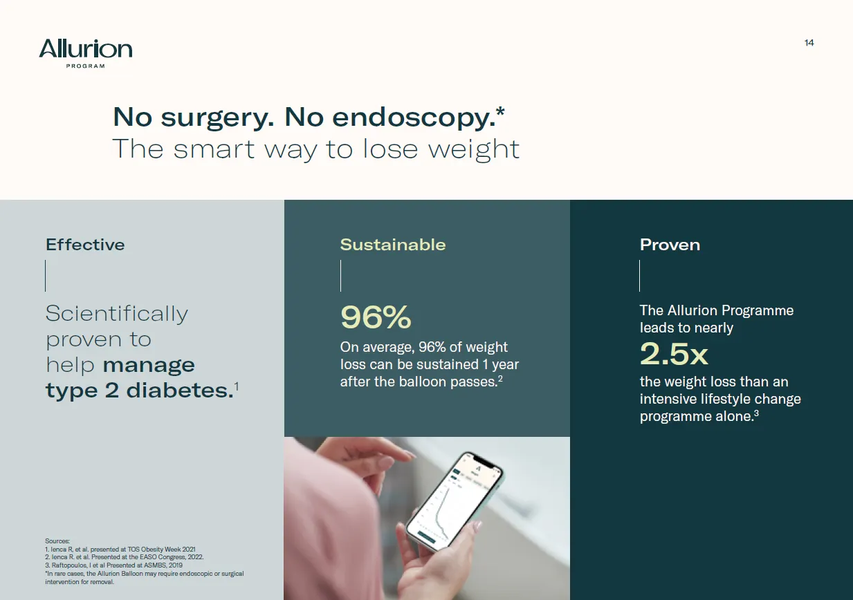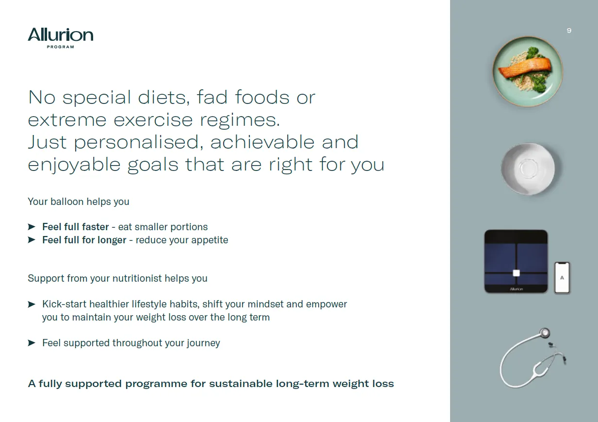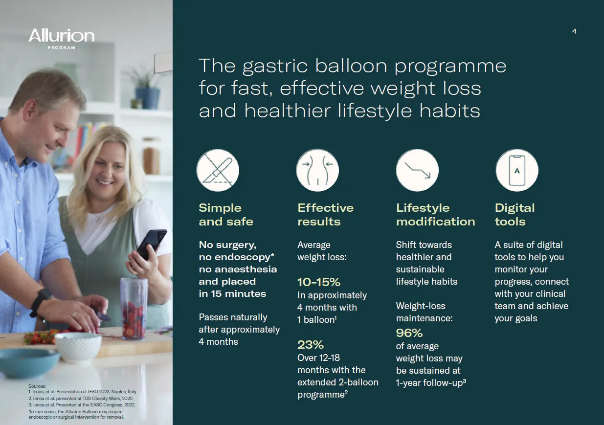 We understand that weight regain after balloon passage is a common fear and source of anxiety. This is why the Allurion Balloon is accompanied by nutritional coaching and medical support to help you change your lifestyle and develop a healthier routine. Once the Allurion Balloon is out of your body, the support from your follow-up team continues until the end of the Allurion Programme to help you maintain the same eating habits.