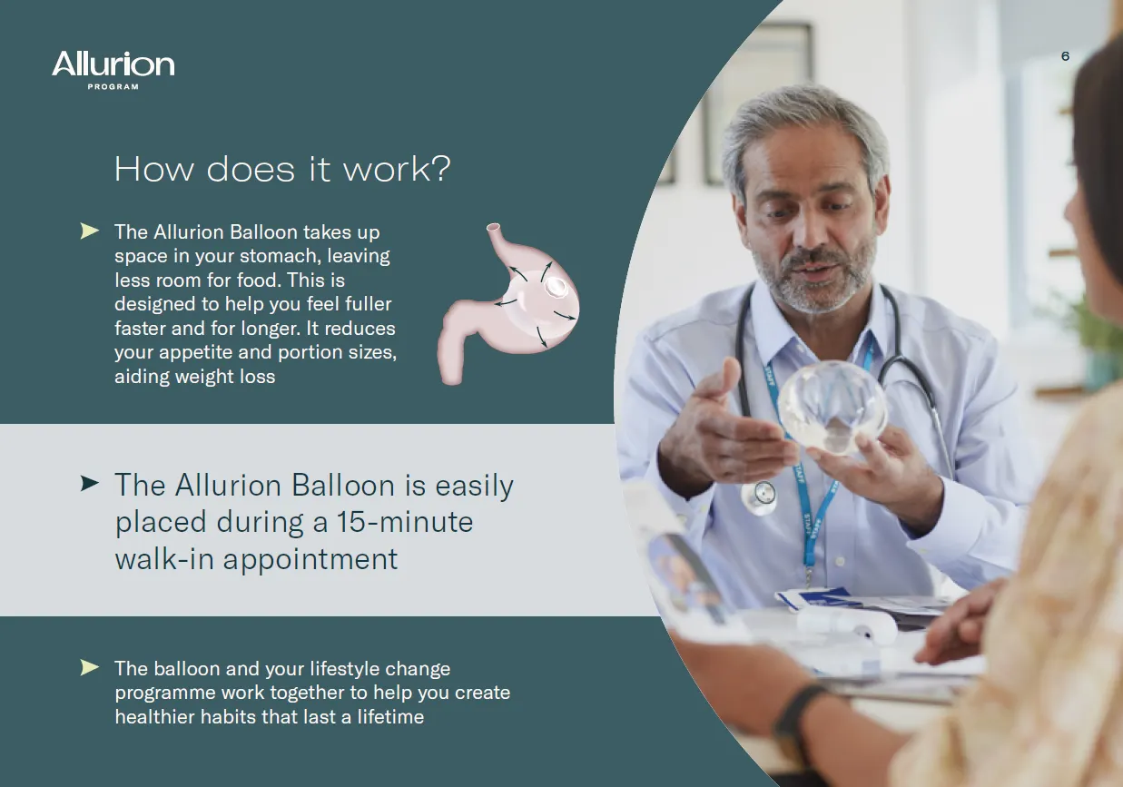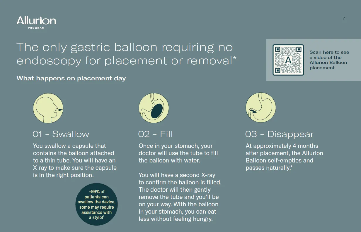 The gastric balloon is a medical device designed to assist with weight loss. It is a soft balloon filled with liquid or air that is placed in the stomach. All gastric balloons have the same mechanism of action to occupy space, promoting a feeling of fullness and reducing food intake4. They typically remain in the stomach for several months before being removed by endoscopy or, in the case of the Allurion Balloon, naturally eliminated.**